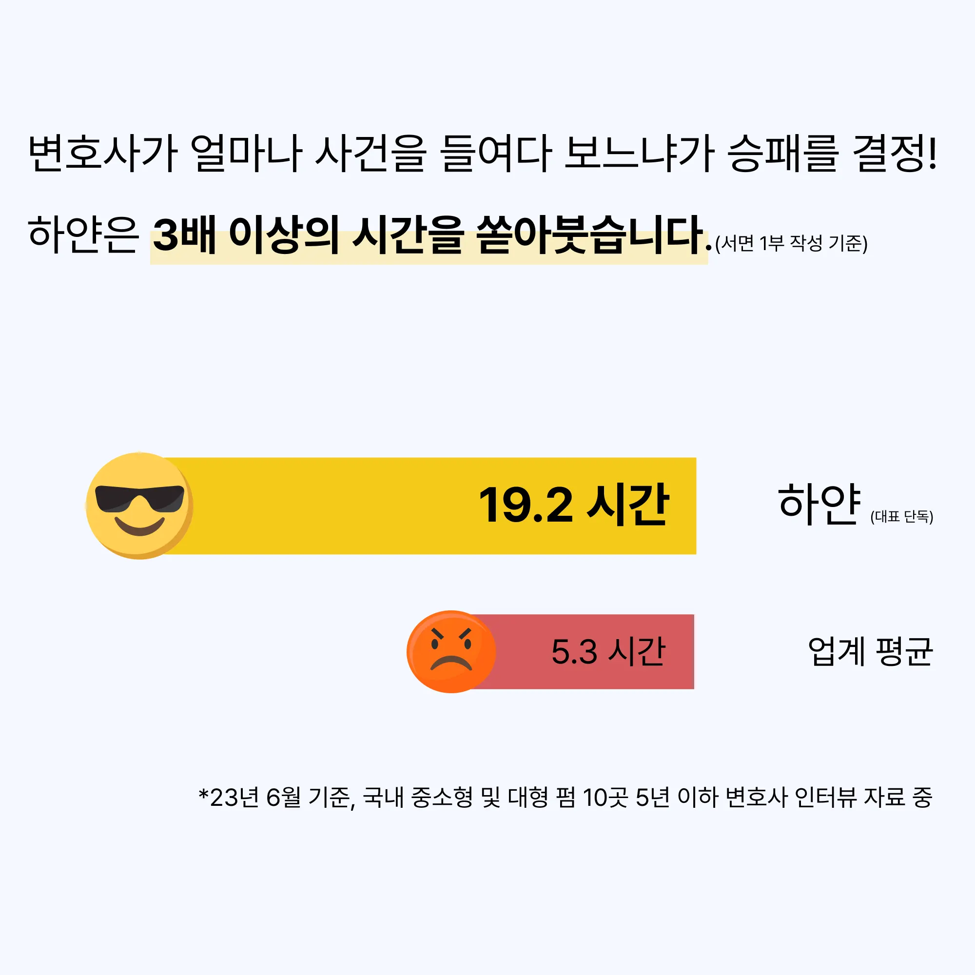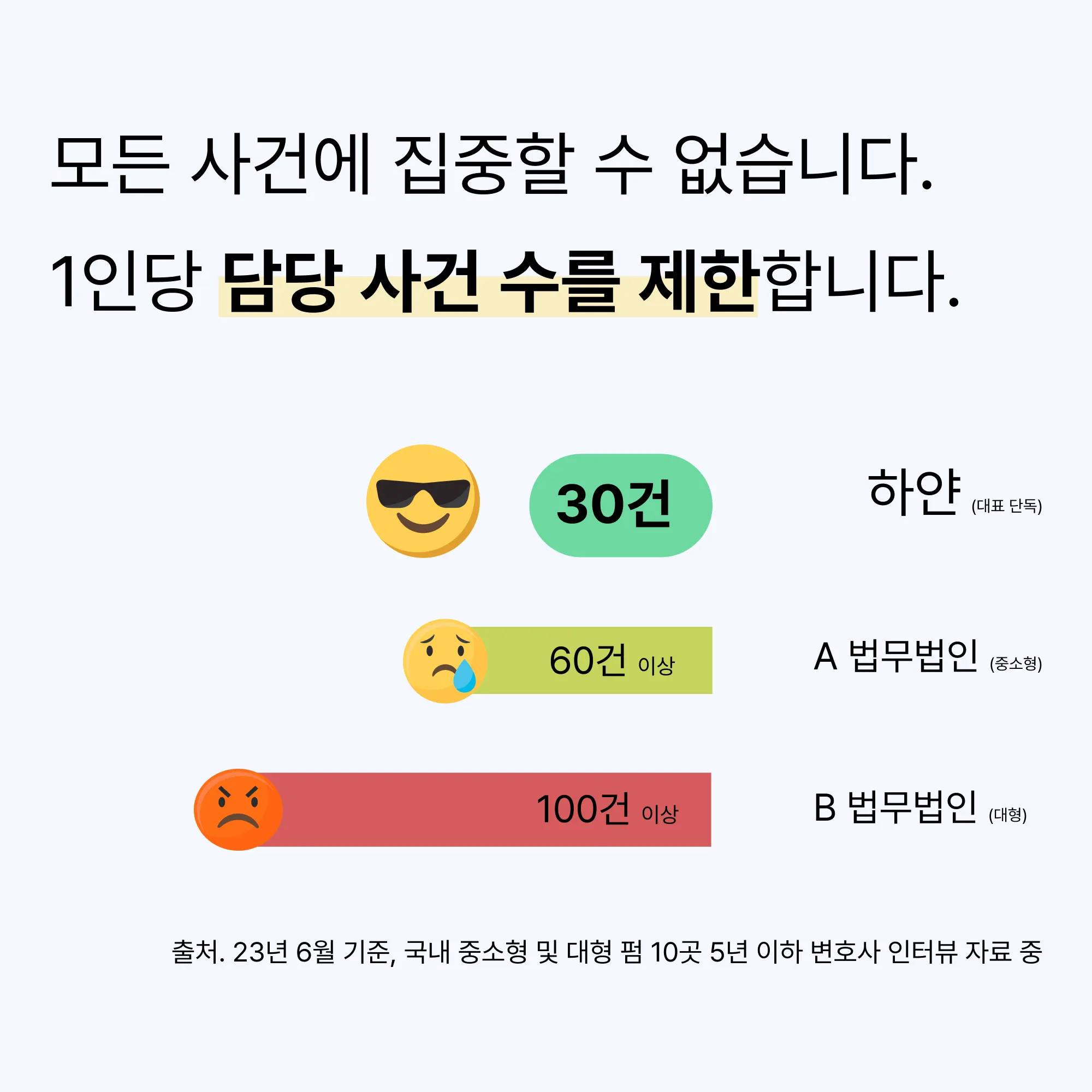 사건 수 제한은 하얀이 의뢰인에게 절대적으로 많은 시간을 투자할 수 있는 이유입니다.